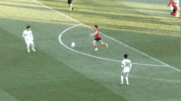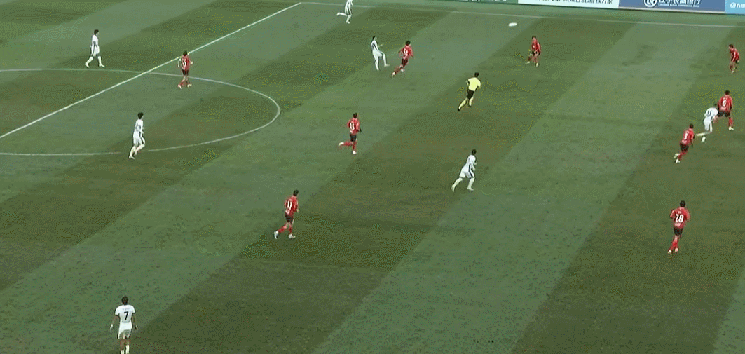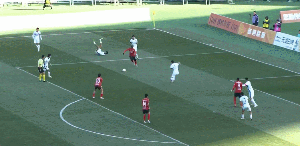 8’邦本宜裕三秒区外带球摆脱守卫起左脚外围射门,李冠希将球挡出