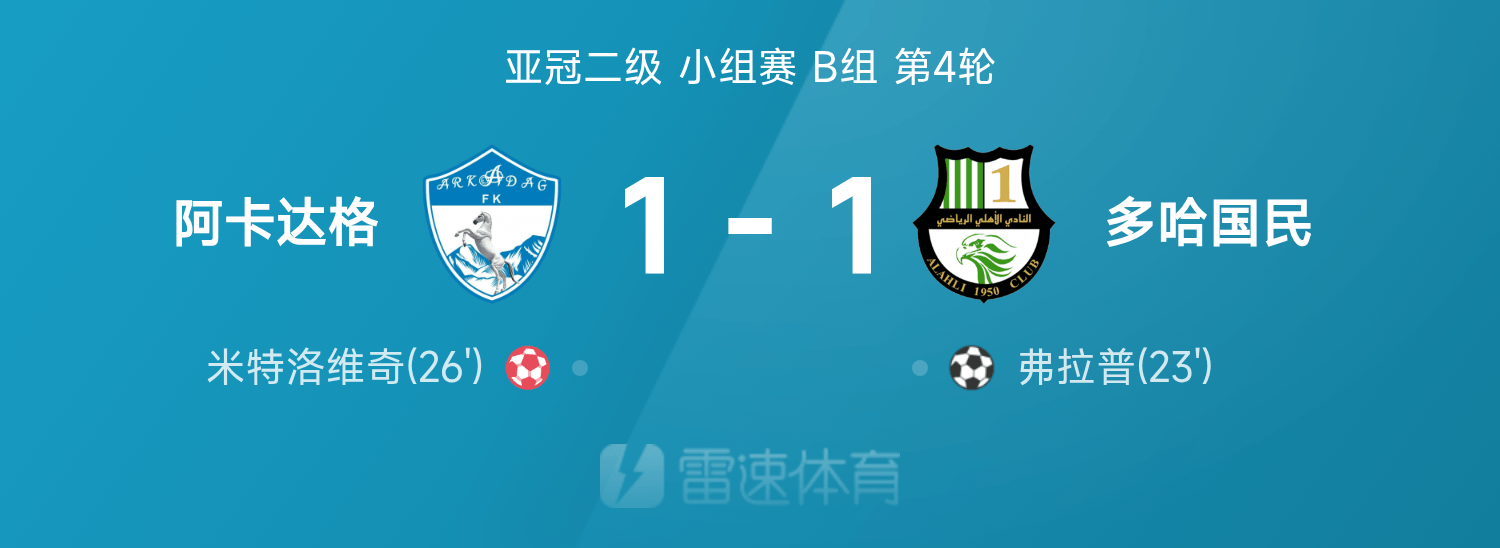 6686体育11月05日讯 25/26赛季亚冠二级分组赛B组第4轮,阿卡达格vs多哈国民。上半场,弗拉普破门建功,米特洛维奇自摆乌龙。下半场,双方均无建树。最终,阿卡达格1-1战平多哈国民。
