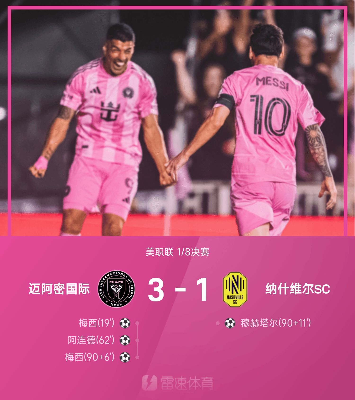 6686体育10月25日讯 2025赛季美职联1/8总决赛首回合,迈阿密国际主队场对阵纳什维尔SC。全场竞赛,梅西上演梅开二度好戏,阿连德也头槌破门,穆赫塔尔虽压哨进球但无济于事,最终迈阿密国际3-1击败纳什维尔,大赛果分1-0领跑位对手。