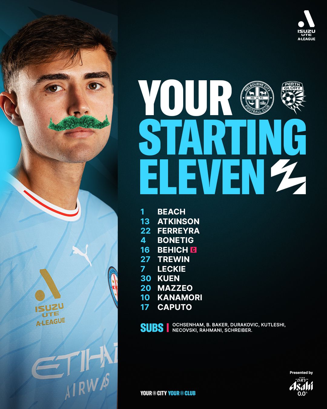 墨尔本城首发阵容:1-比奇、22-费雷拉、27-特里温、4-博内蒂格、7-莱基、30-库恩、10-金森健志、16-贝希奇、13-阿特金森、17-卡普托、20-马泽奥