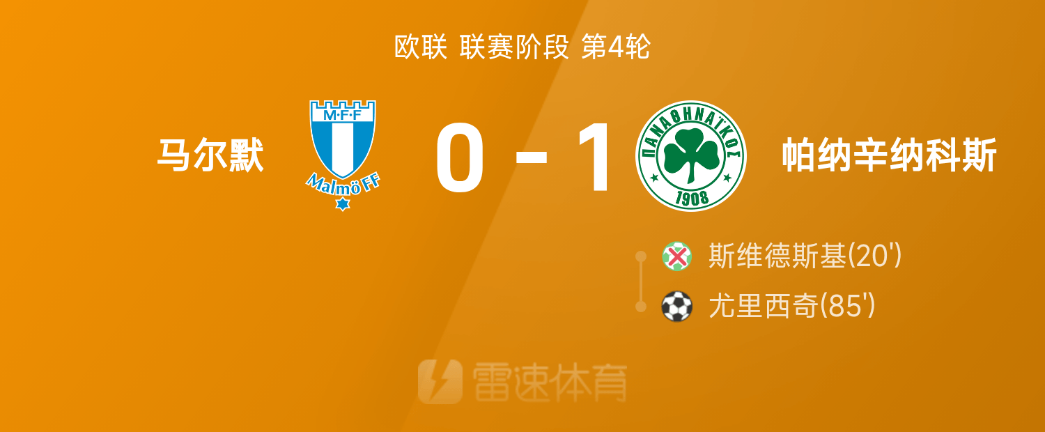 欧联战报:尤里西奇破门制胜,帕纳辛纳科斯1-0战胜马尔默