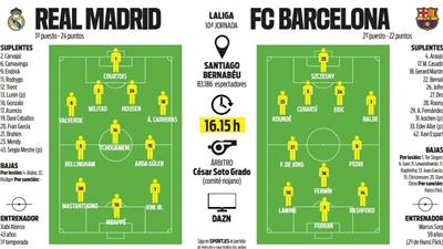 6686体育10月26日讯 西甲第10轮将迎来万众瞩目的西班牙国家德比,皇马将坐镇在主队场迎战巴萨。西班牙媒体《每日体育报》预测了双方本场竞赛的首发阵容。