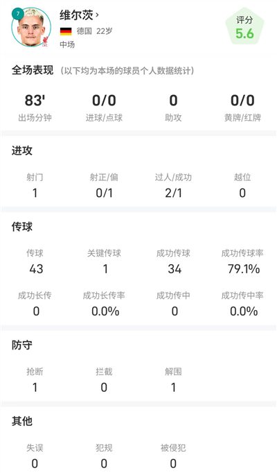 维尔茨全场数据:出场83分钟仅1次打门,2次过人1次胜利
