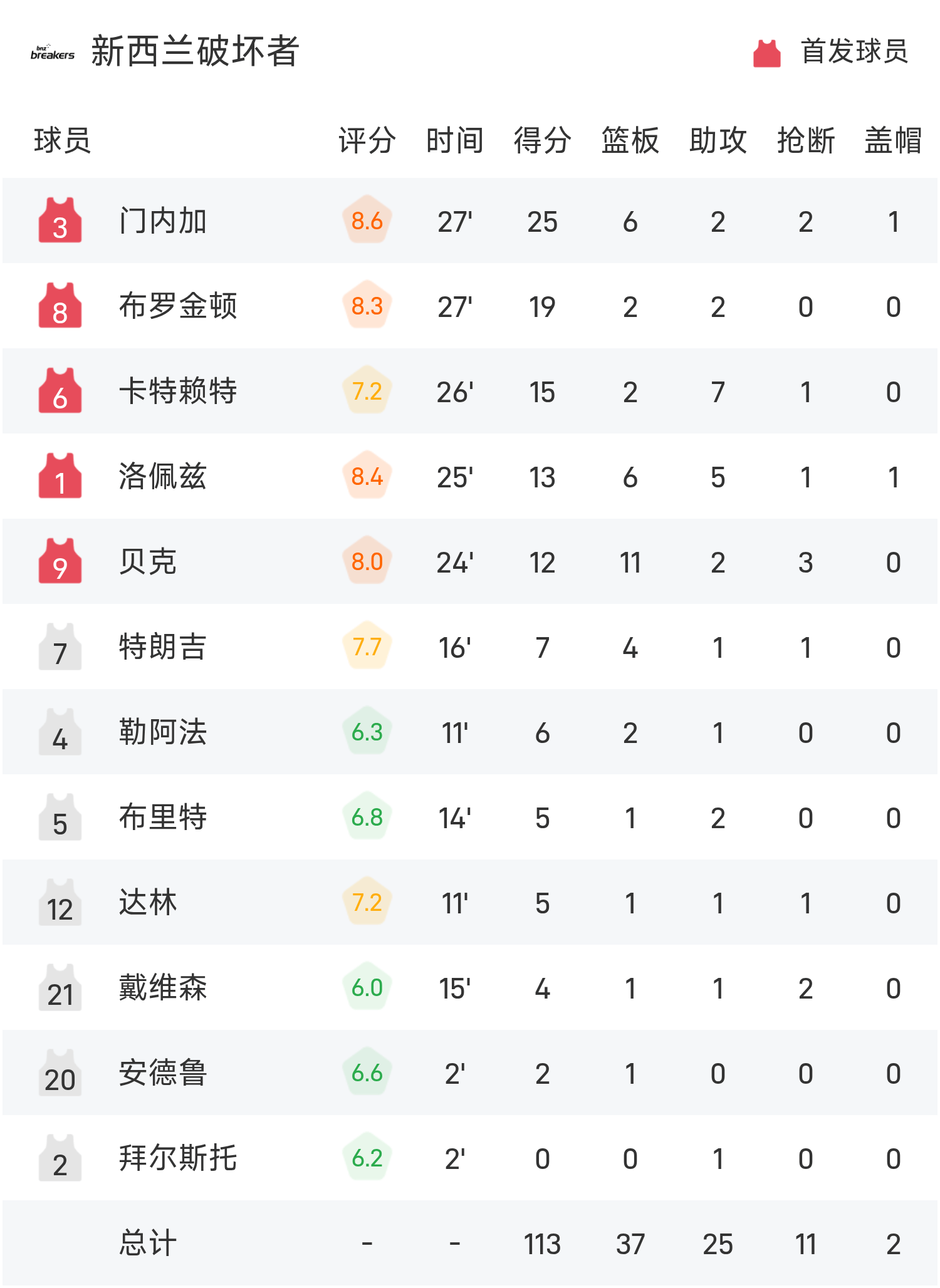 NBL战报:门内加25分6板,新西兰毁坏者113-84大胜布里斯班子弹