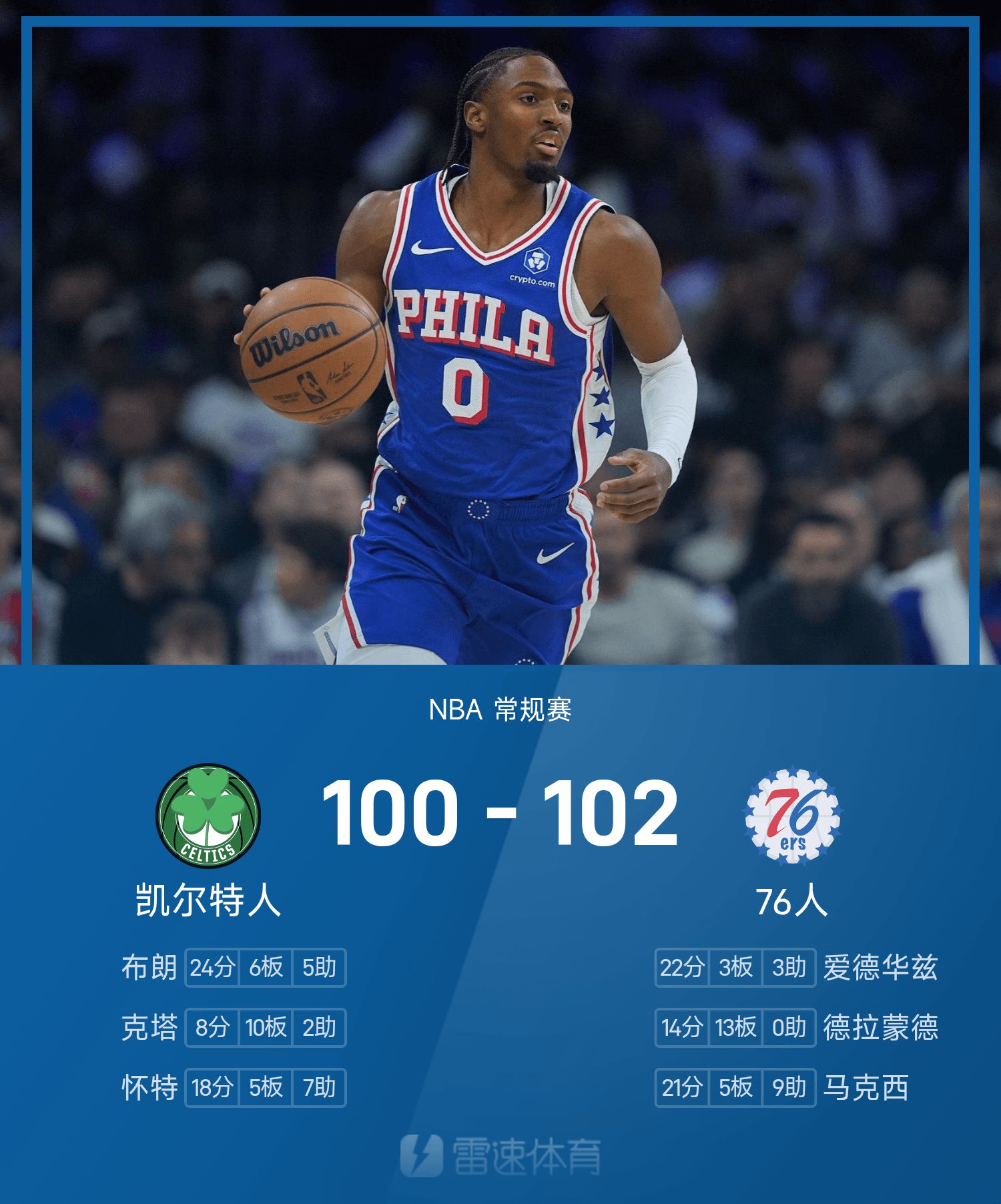 双方全场战罢,76人102-100战胜凯尔特人。