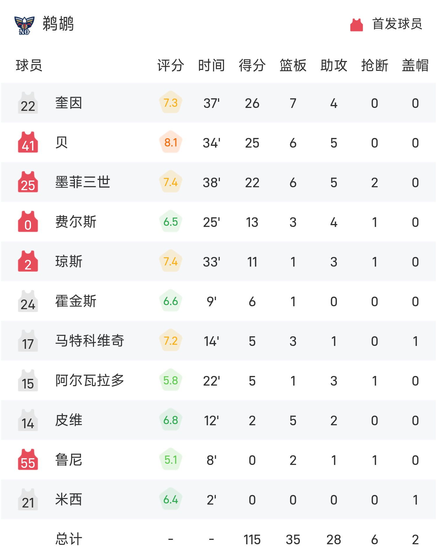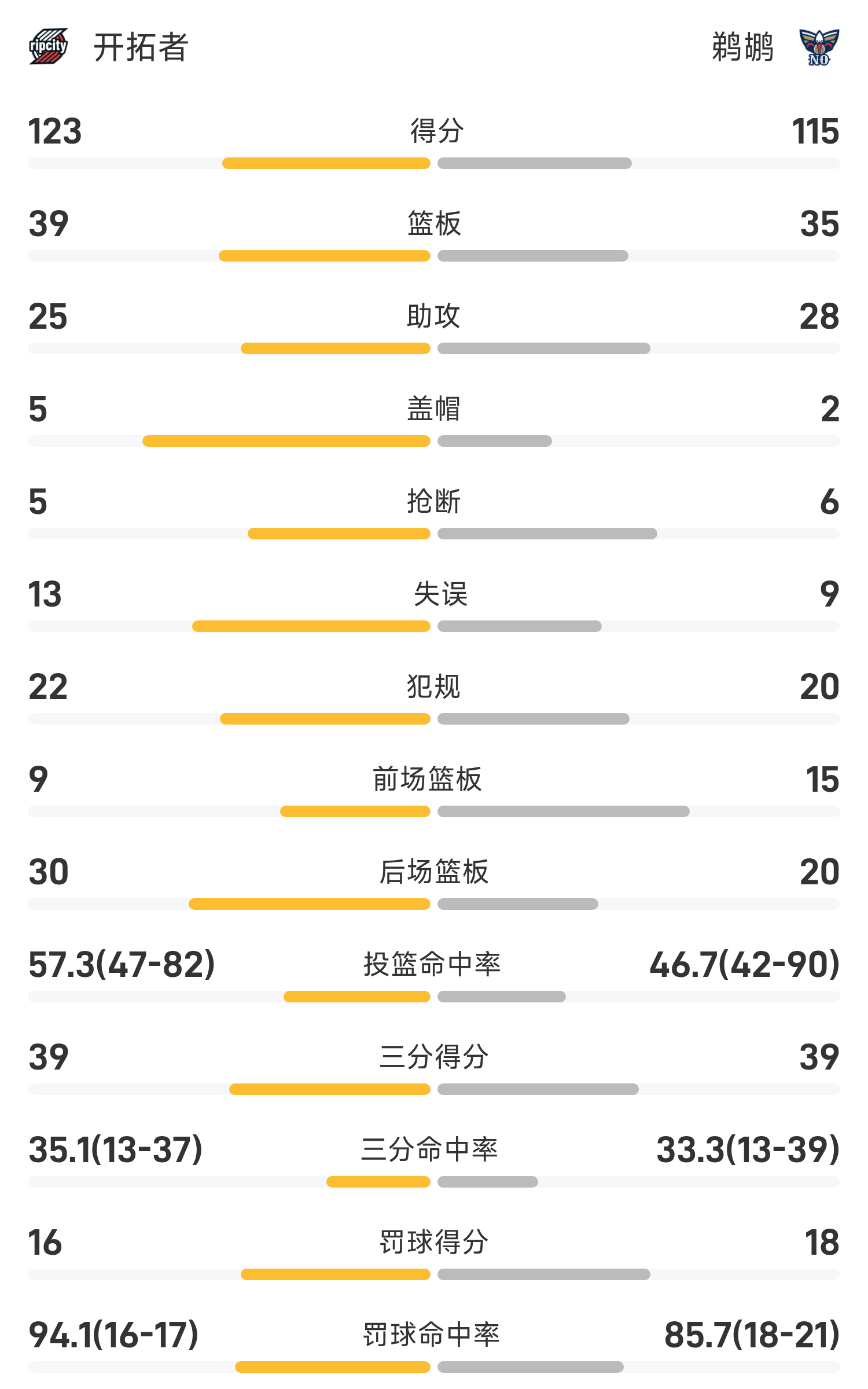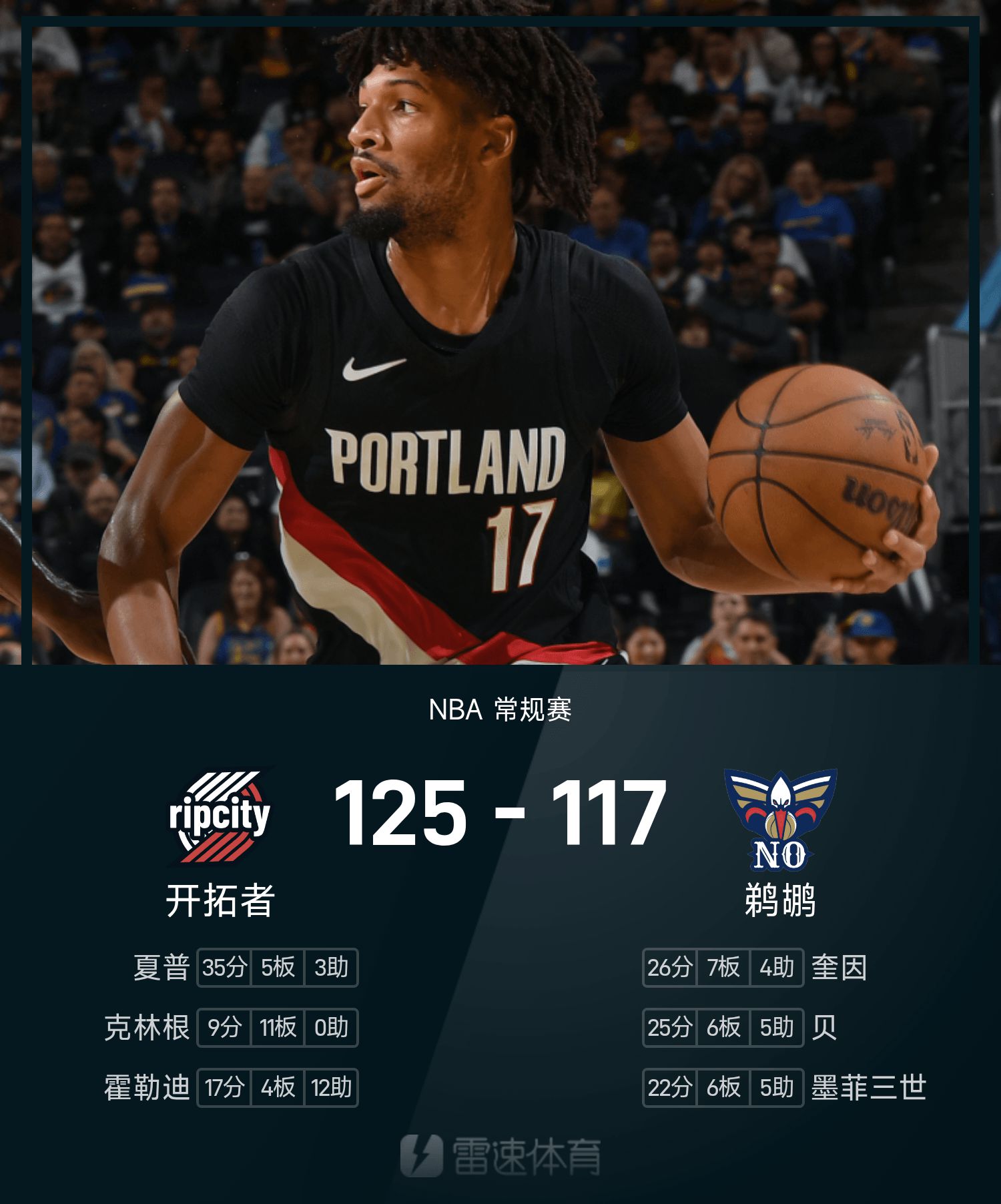 6686体育11月13日讯 25/26赛季NBA 常规赛,鹈鹕对阵开拓者。双方全场战罢,鹈鹕117-125不敌开拓者。夏普砍下全场最高的35分5板3助,率领开拓者胜利取胜。